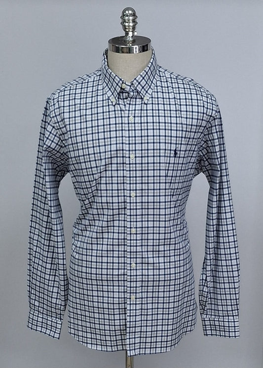 Camisa Polo Ralph Lauren 🏇🏼 color blanco con patrón de cuadros azul y gris Talla XL Entalle Clásico