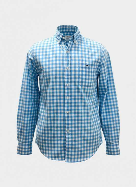 Camisa Vineyard Vines 🐳 con patron de cuadros en color celeste, azul navy y blanco Talla S Entalle Clásico