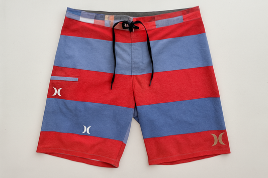 Short de baño Hurley 🏄🏽♂️ con patron de cuadro en color rojo, azul y celeste y logo en color plateado talla M
