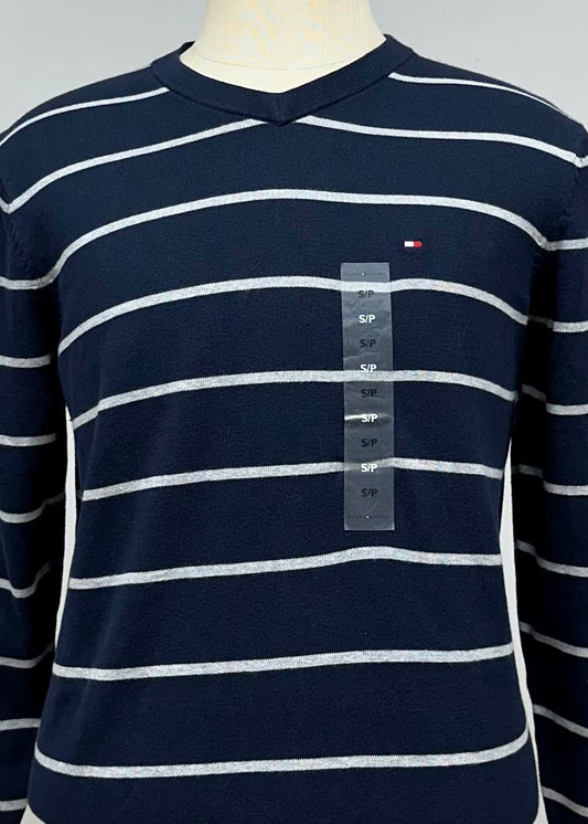Sueter Jersey con cuello V Tommy Hilfiger 🇺🇸 color azul oscuro con rayas en color gris Talla S