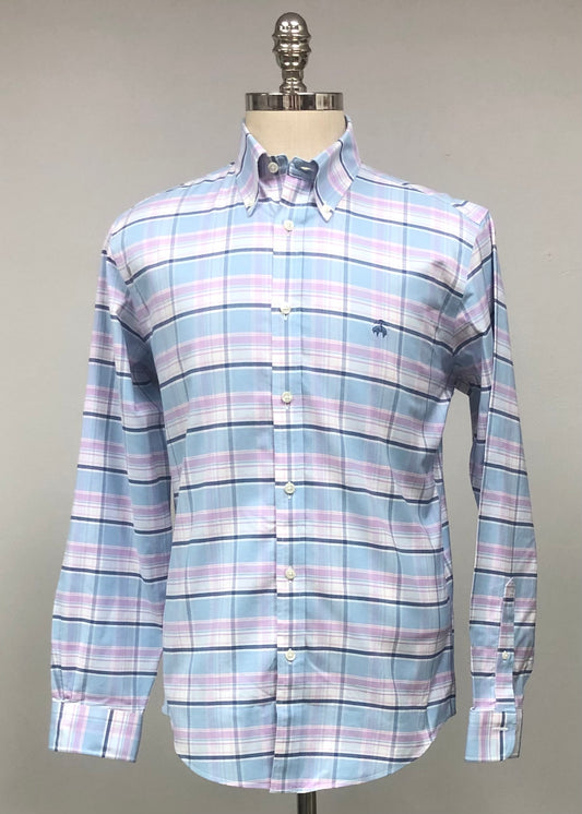 Camisa Brooks Brothers 🐑 color blanco con cuadros tartán en rosado y celeste Talla M Entalle Regular