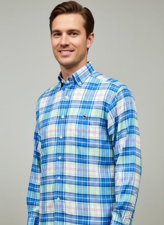 Camisa de botones Vineyard Vines 🐳 de cuadros en color celeste, turquesa y blanco Talla S Entalle Clásico