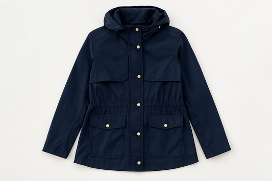 Jacket de mujer con capucha marca Cole Haan color azul navy y con zíper completo Talla L