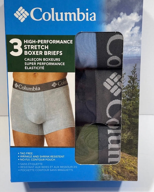 Combo de 3 Boxers Briefs Columbia 🔷 Tela de algodón stretch color celeste, azul y verde oliva Talla XL