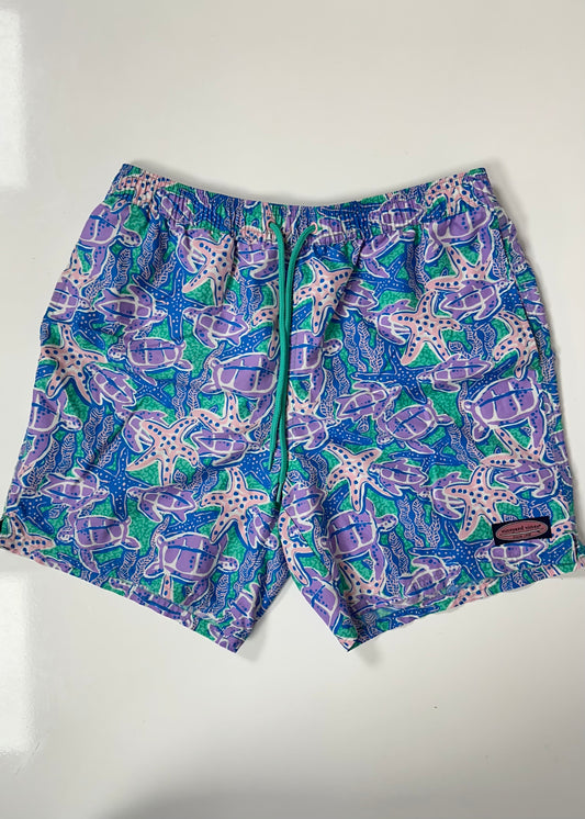 Short de baño Vineyard Vines 🐳 con diseño de tortugas en color morado y verde talla M
