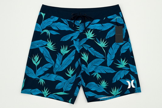 Short de baño Hurley 🏄🏽♂️ color negro con patrón de hojas en celeste Talla 32