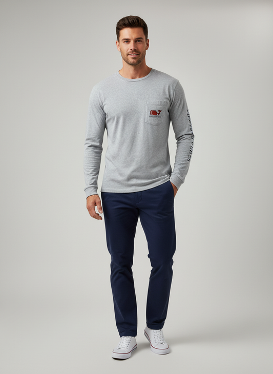Camiseta de bolsillo Vineyard Vines 🐳 color gris claro con Diseño de ballena de Futbol Americano Talla M