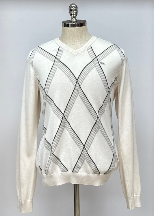 Sueter Jersey con cuello V Lacoste 🐊 color crema con patrón de líneas grises Talla M