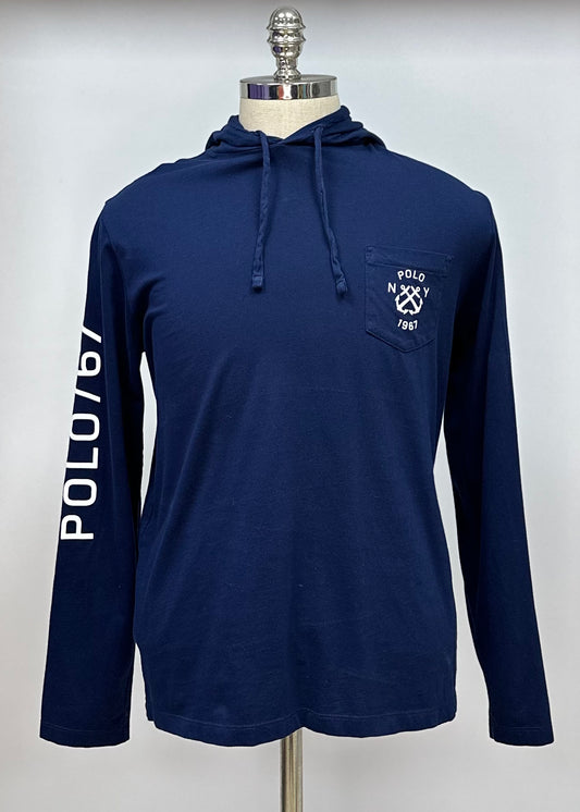 Sueter Jersey con capucha Polo Ralph Lauren 🏇🏼 color azul navy con diseño de escudo Talla L Entalle Custom Slim Fit