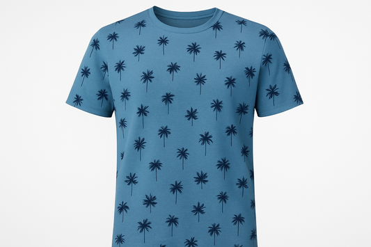 Camiseta cuello Redondo Denim & Flower 🇺🇸 color celeste con diseño de palmeras en color negro Talla M