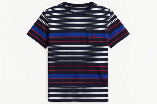 Camiseta cuello Redondo Polo Ralph Lauren 🏇🏼 con patron de rayas en azul, blanco y rojo manga corta Talla Large Entalle Clásico