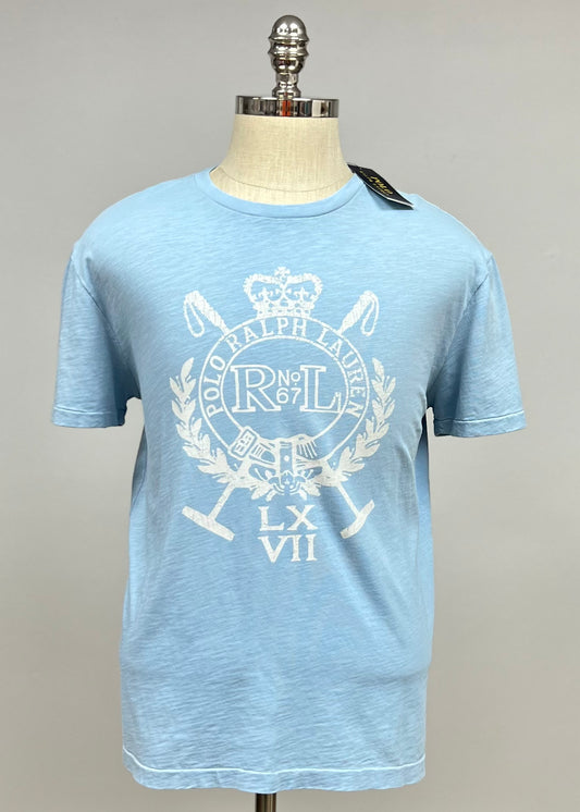 Camiseta cuello Redondo Polo Ralph Lauren 🏇🏼 color Celeste con diseño de escudo manga corta Talla Medium Entalle Clásico
