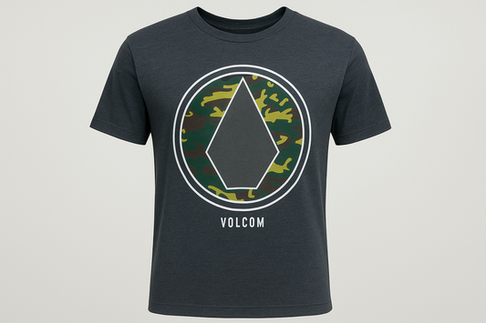 Camiseta cuello redondo Volcom 🛹 color gris oscuro y logo con diseño de camuflaje manga corta Talla M