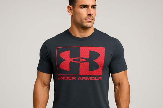 Camiseta cuello redondo Under Armour 🏋🏽 color gris oscuro con logo en rojo manga corta Talla M