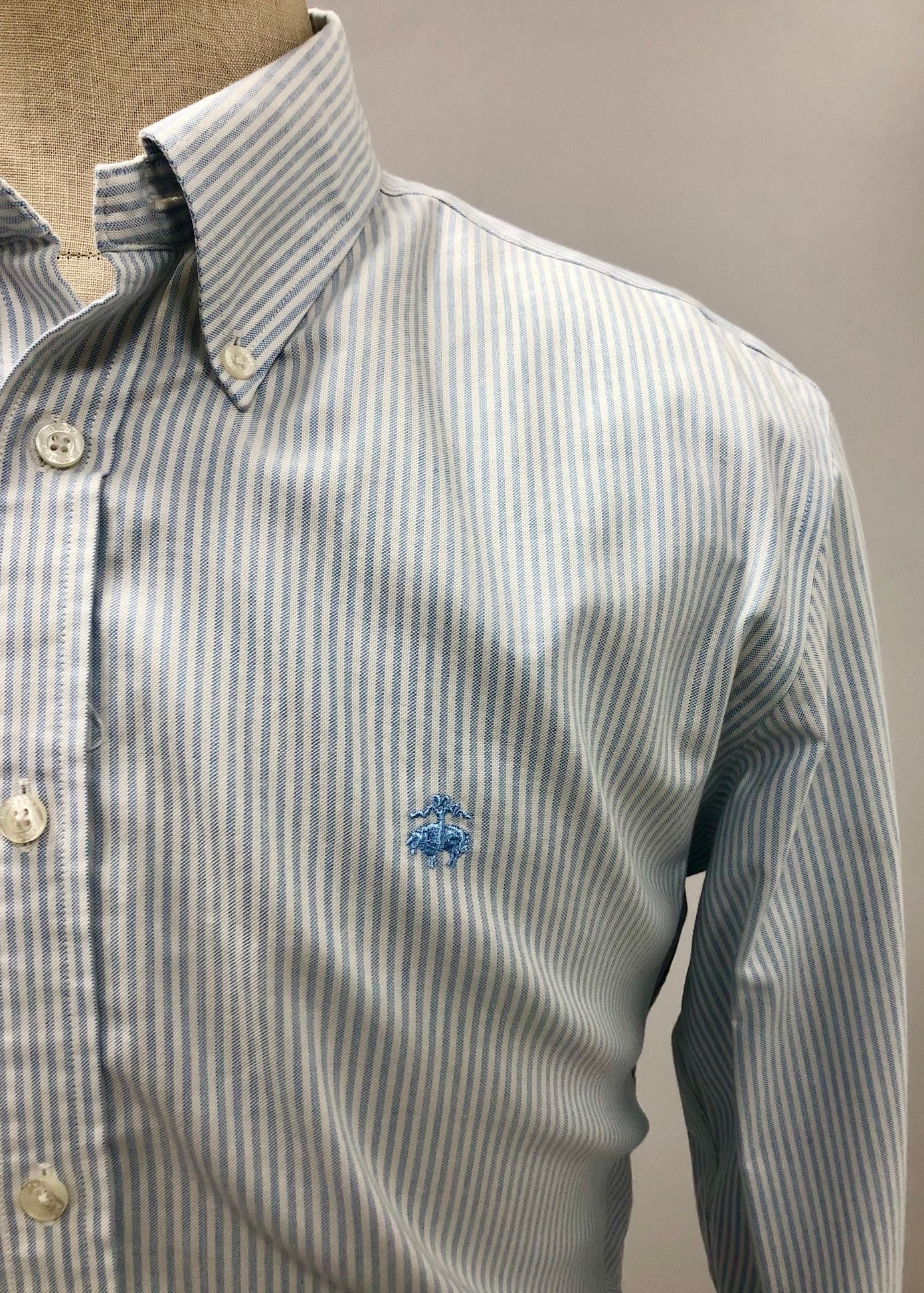Camisa de botones Brooks Brothers 🐑 - Talla Large - Entalle Regular - Manga larga - Con patrón de rayas en color celeste y blanco con logo en celeste - Tela 100% algodón Oxford - Cuello en punta abotonada - Como nuevo 10/10 - Precio $40 💵 DM 📩 Por si tiene alguna consulta