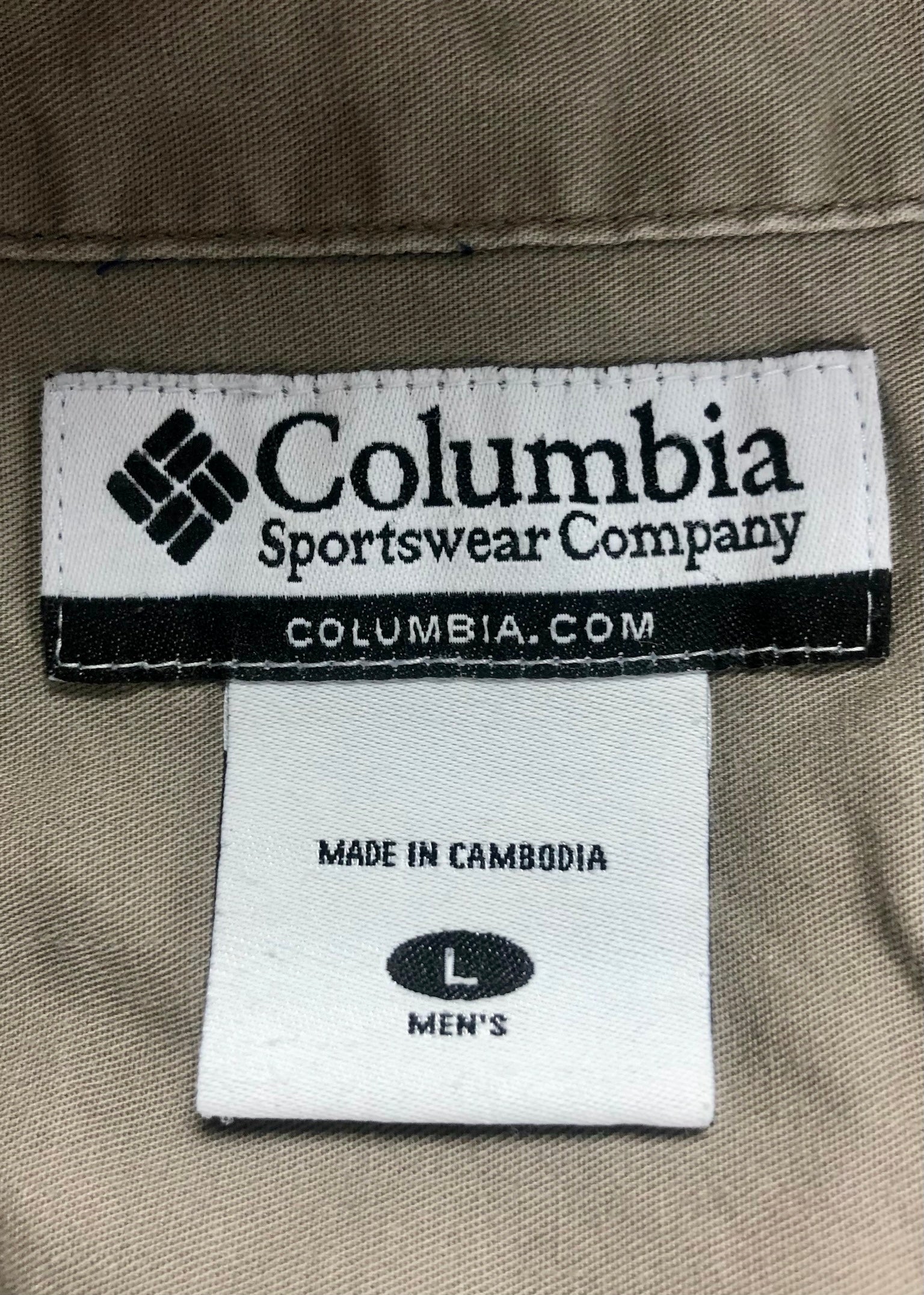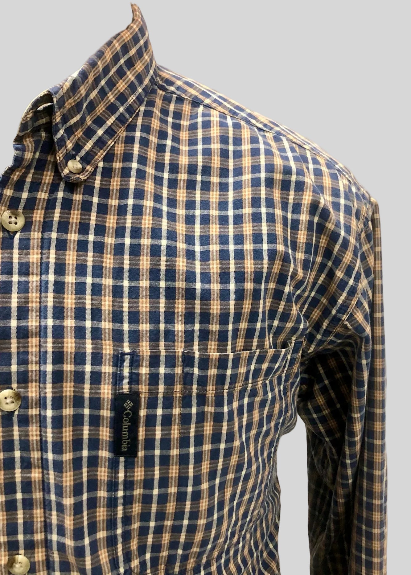 Camisa de botones Columbia 🔹 con patrón de cuadros en color azul, kaki y blanco Talla L