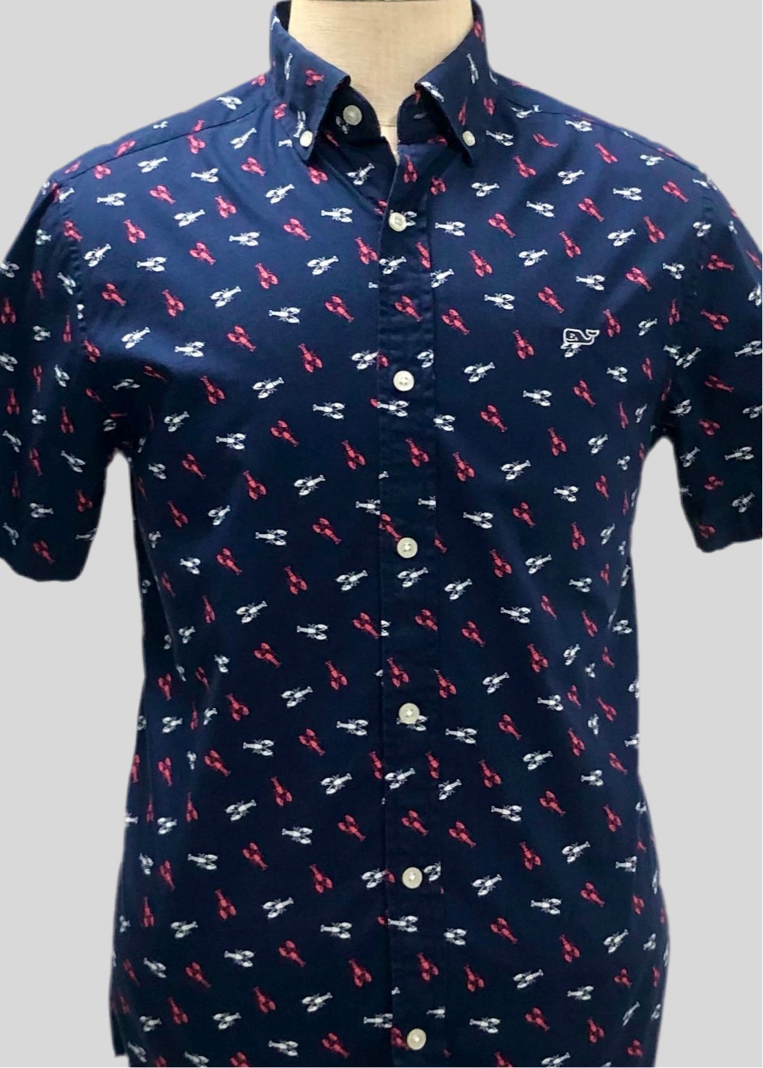Camisa de botones Vineyard Vines 🐳 - Talla Small - Entalle Regular - Manga corta - Color azul navy con diseño de langosta en color rojo y blanco con logo tradicional - Tela algodón - Cuello en punta abotonada - Nuevo con su etiqueta - Precio $40 💵 DM 📩 Por si tiene alguna consulta