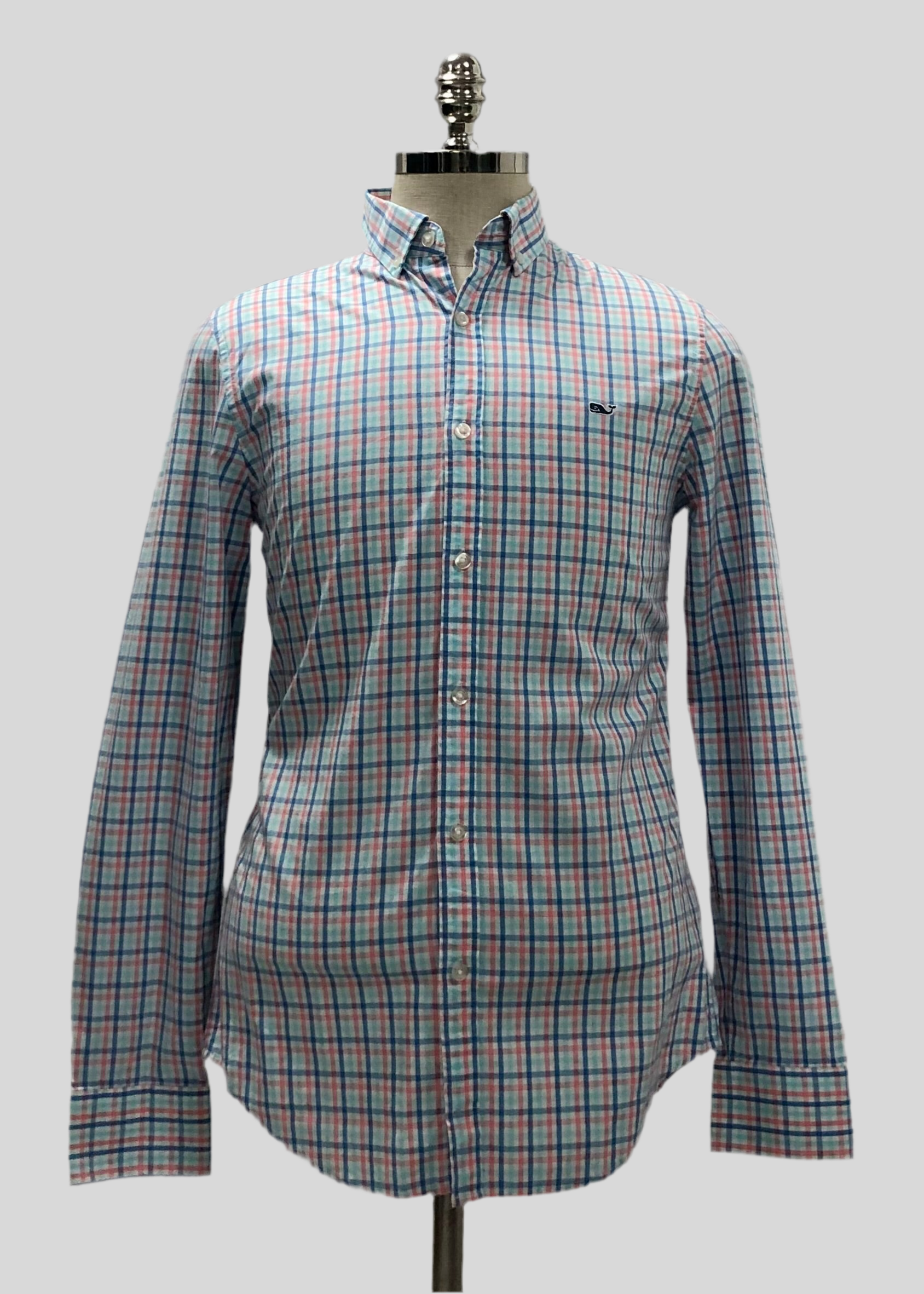 Camisa de botones Vineyard Vines 🐳 - Talla Small - Entalle Slim Fit - Manga larga - Color azul con patrón de cuadros tartán en color celeste, blanco y rosado con logo bordado tradicional - Tela 100% algodón - Cuello en punta abotonada - Como nuevo 10/10 - Precio $40 💵 DM 📩 Por si tiene alguna consulta
