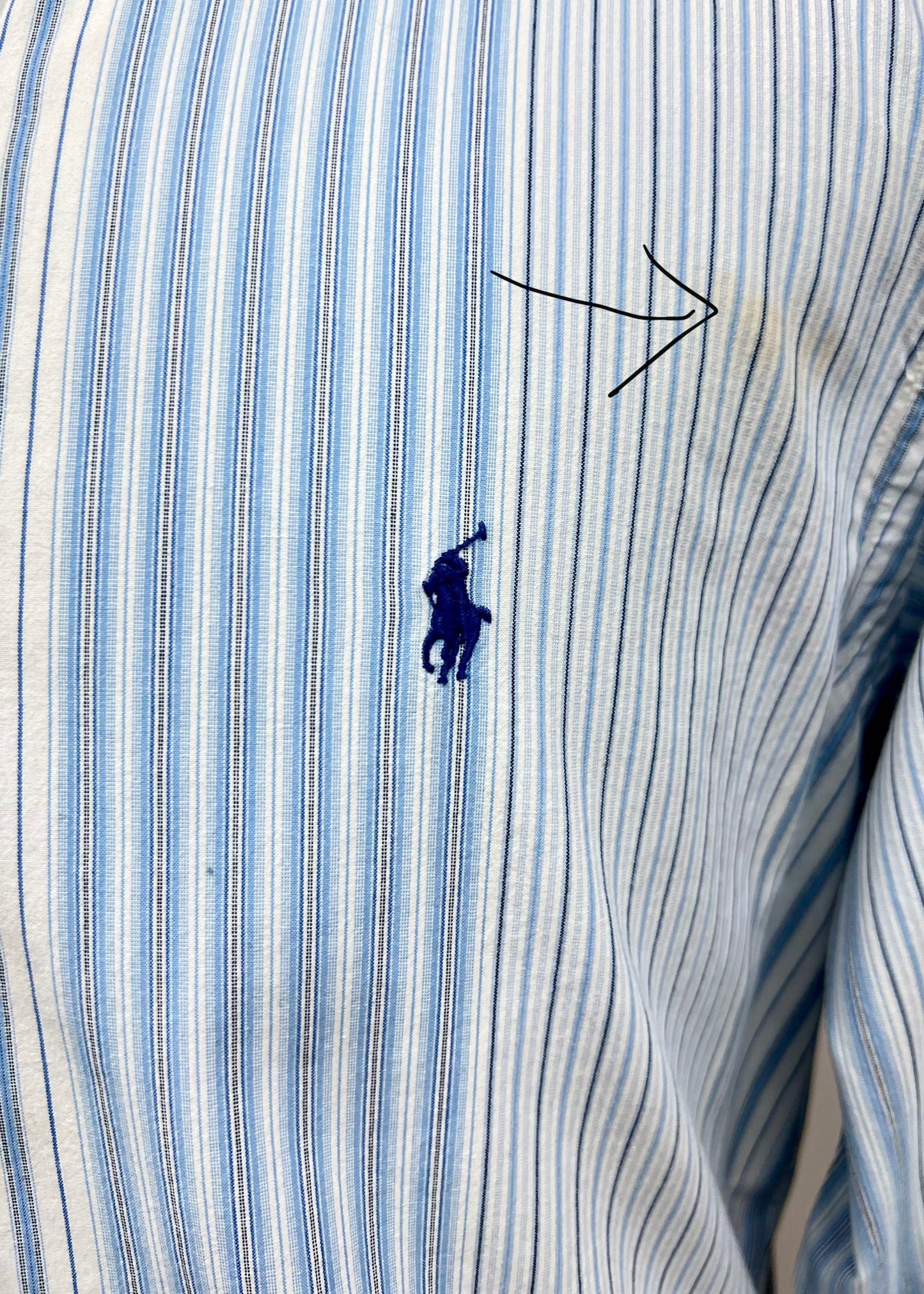 Camisa de botones Polo Ralph Lauren 🏇🏼 - Talla Large - Entalle Clásico - Manga larga - Color blanco con patrón de rayas en celeste y azul navy con logo bordado en color azul navy - Tela 100% Algodón - Cuello en punta abotonada - Como nuevo 8/10 (ver ultima foto mancha a lado del logo)- Precio $25 💵 DM 📩 Por si tiene alguna consulta