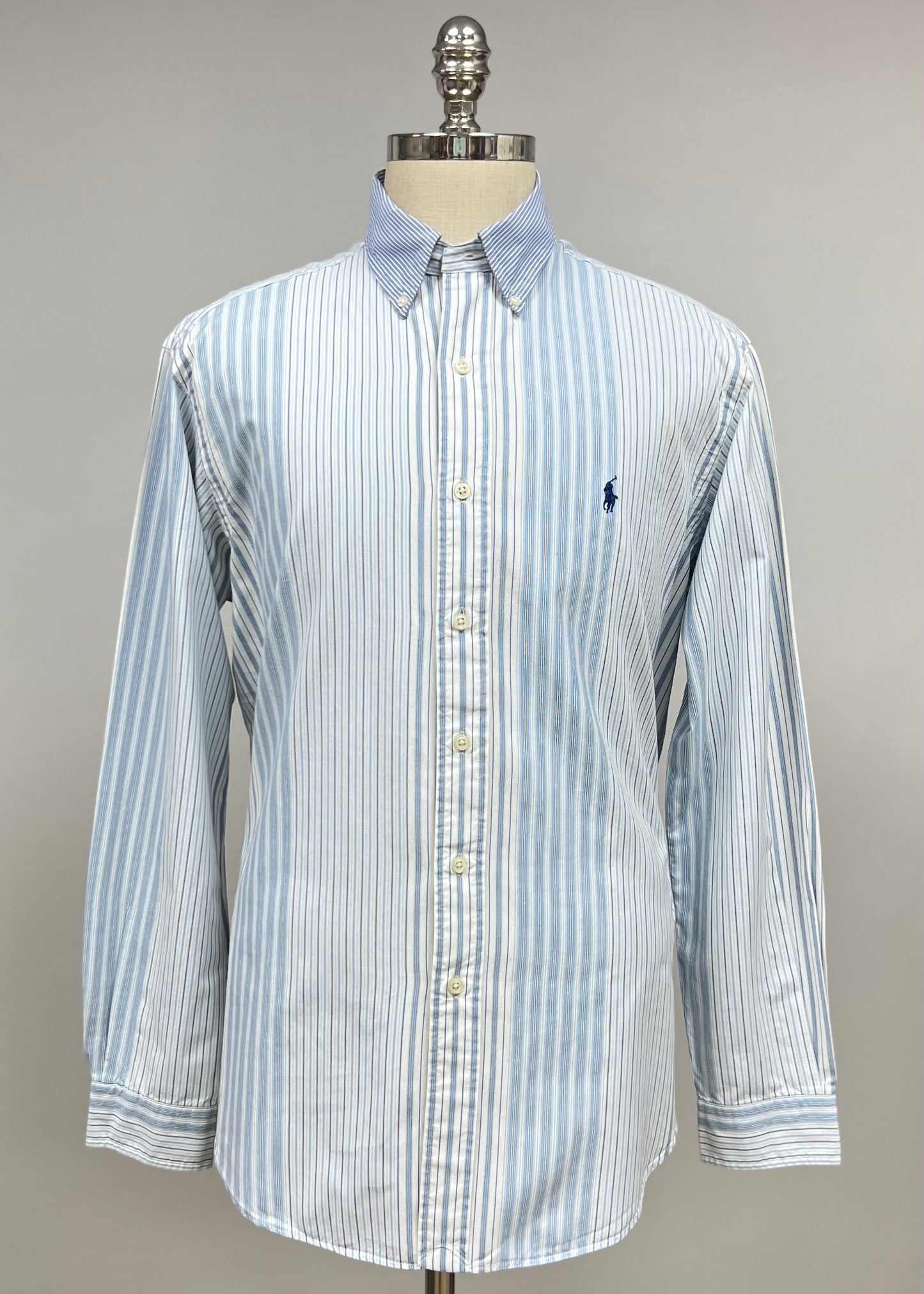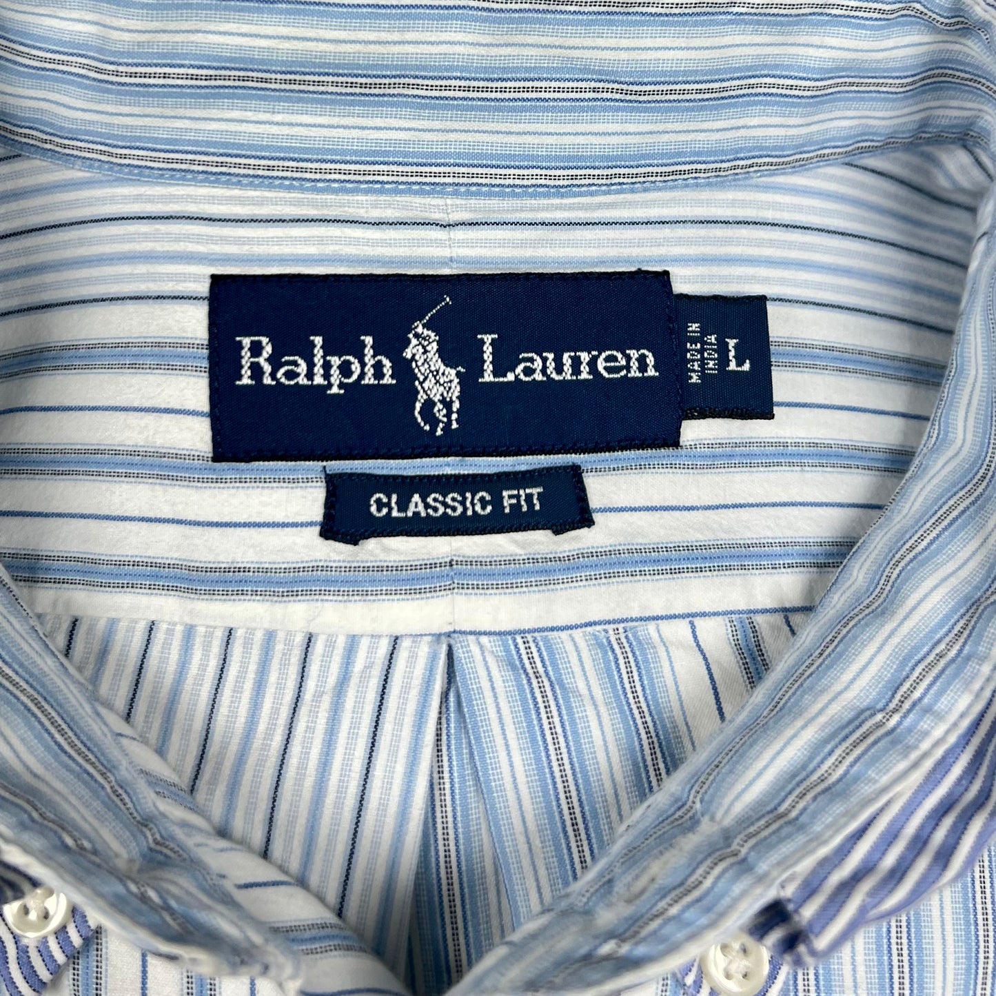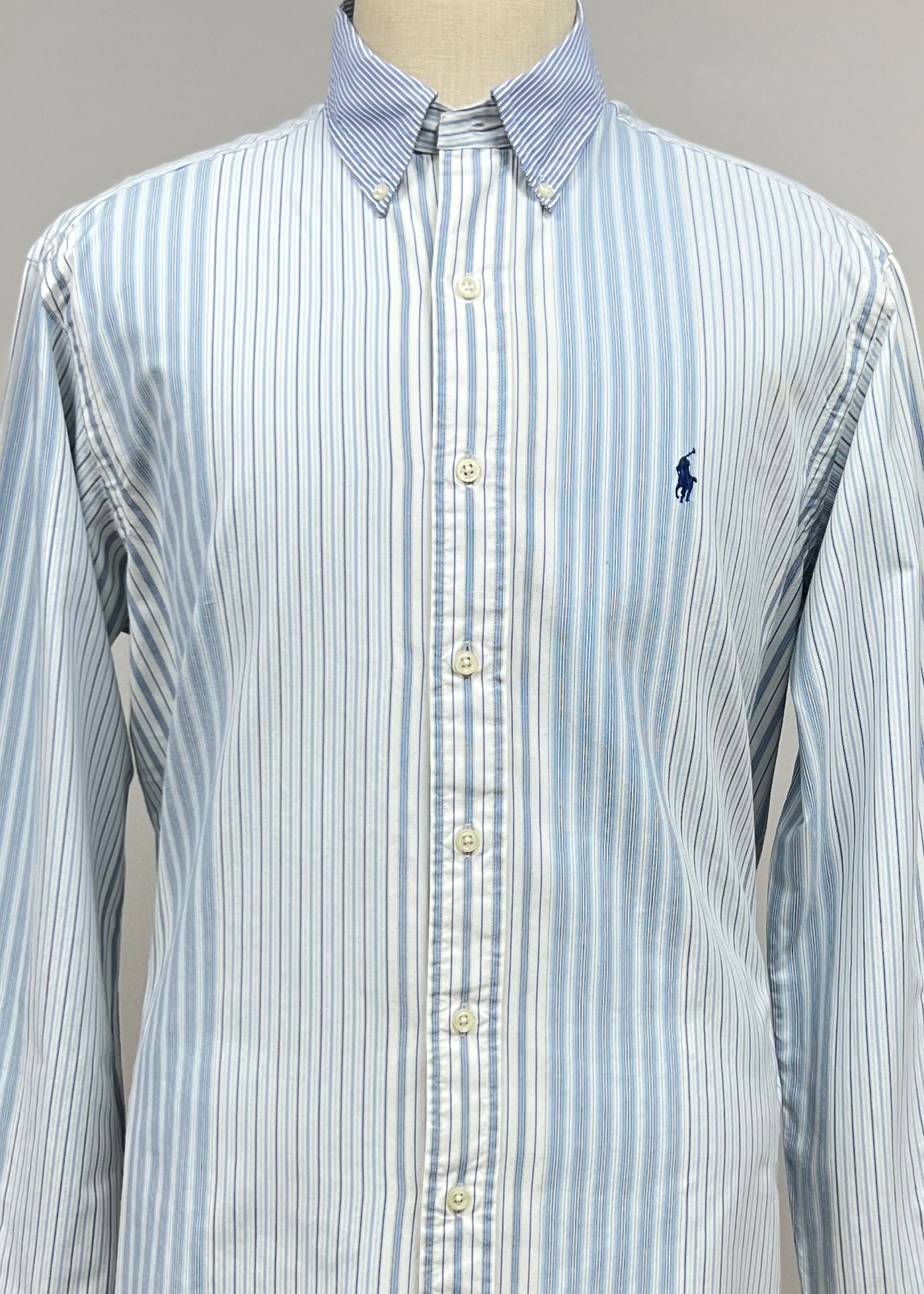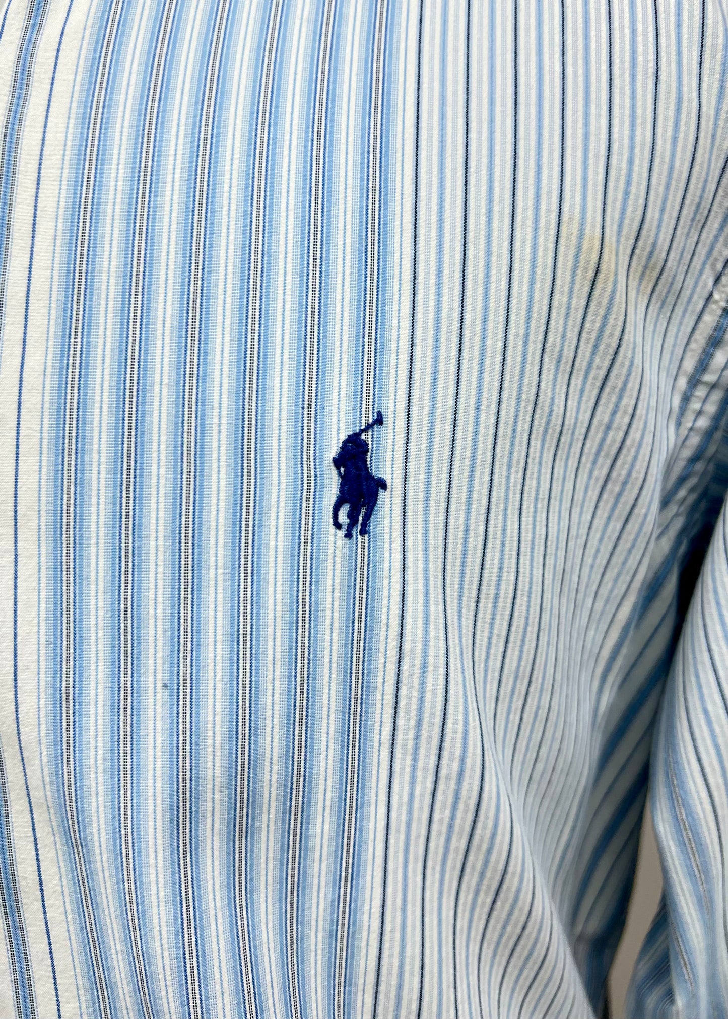 Camisa Polo Ralph Lauren 🏇🏼 color Blanco con patron de rayas en celeste y azul navy Talla L Entalle Clásico (ver descripción)