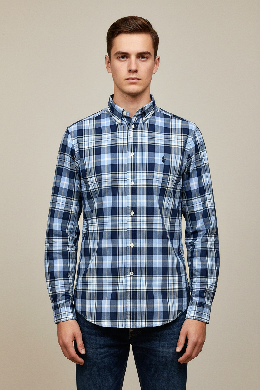 Camisa Polo Ralph Lauren 🏇🏼 con patron de cuadros en azul, celeste y blanco Talla XL de niño Entalle Regular