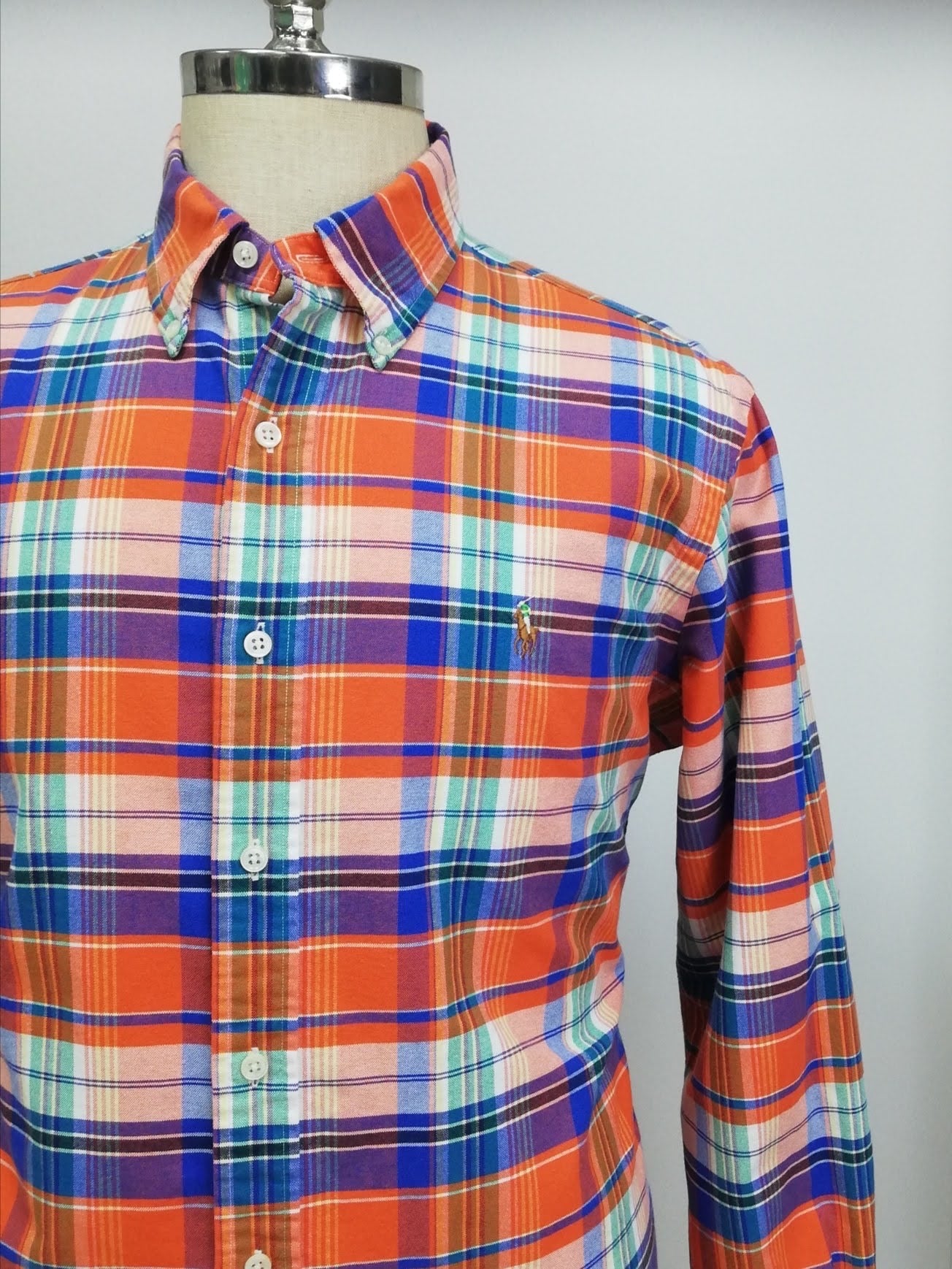 Camisa de botones Polo Ralph Lauren 🏇🏼 - Talla Large - Entalle Clásico - Manga larga - Con patrón de cuadros en color naranja, azul blanco con logo bordado tradicional multicolor - Tela 100% Algodón Oxford - Cuello en punta abotonada - Como nuevo 10/10 - Precio $40 💵 DM 📩 Por si tiene alguna consulta
