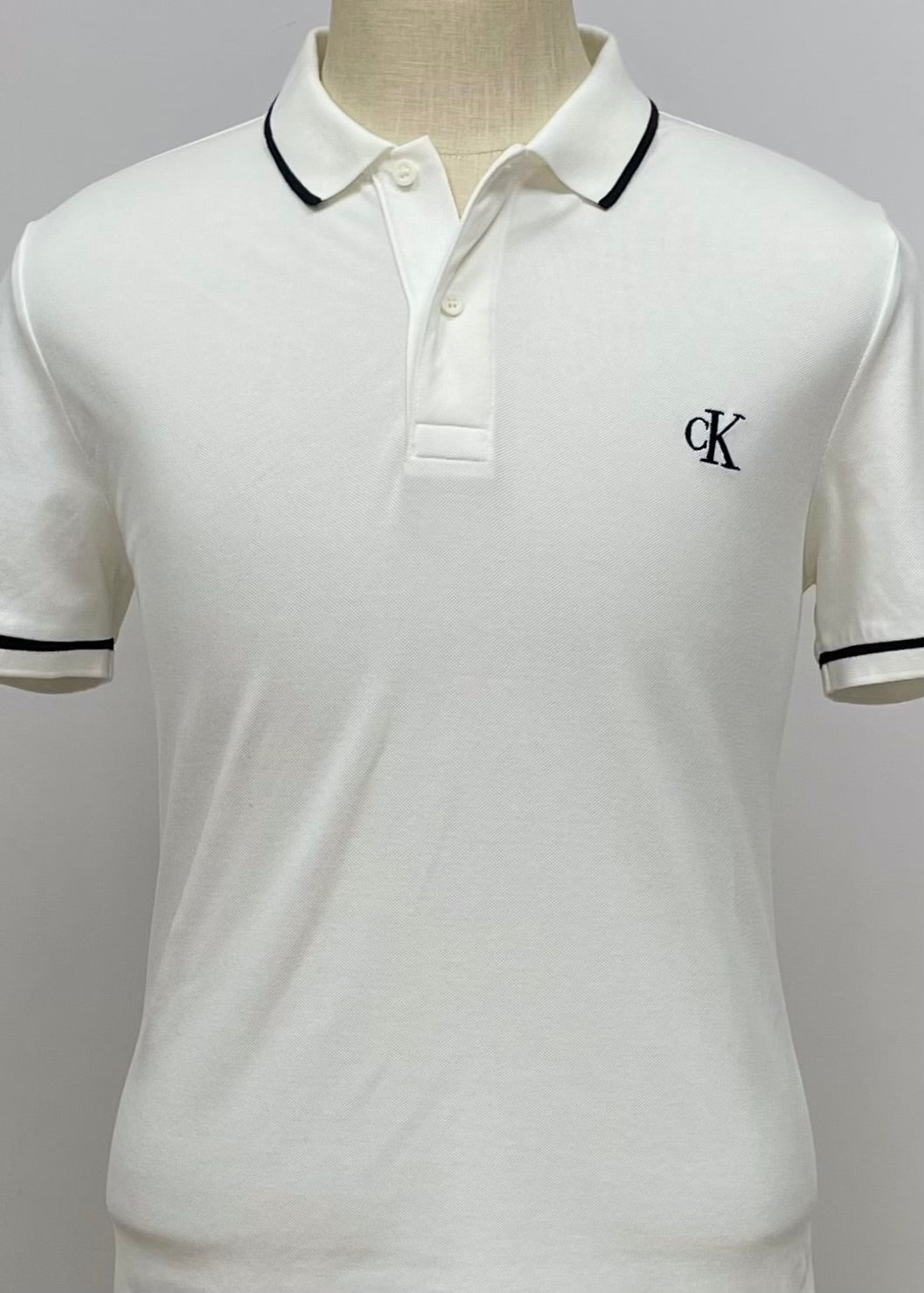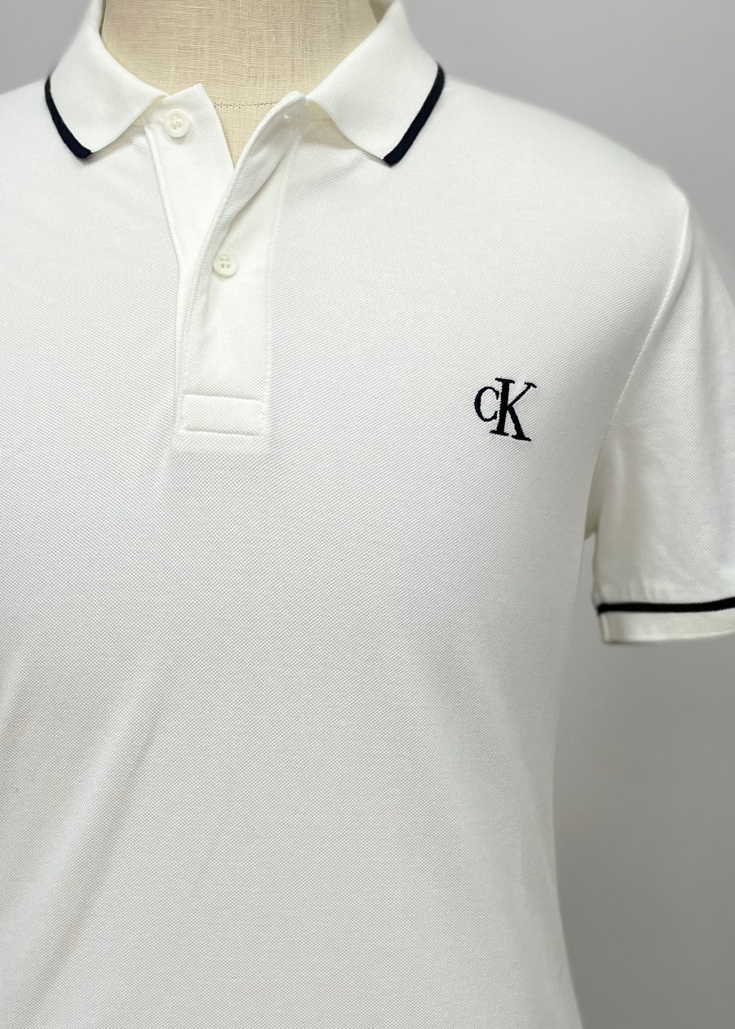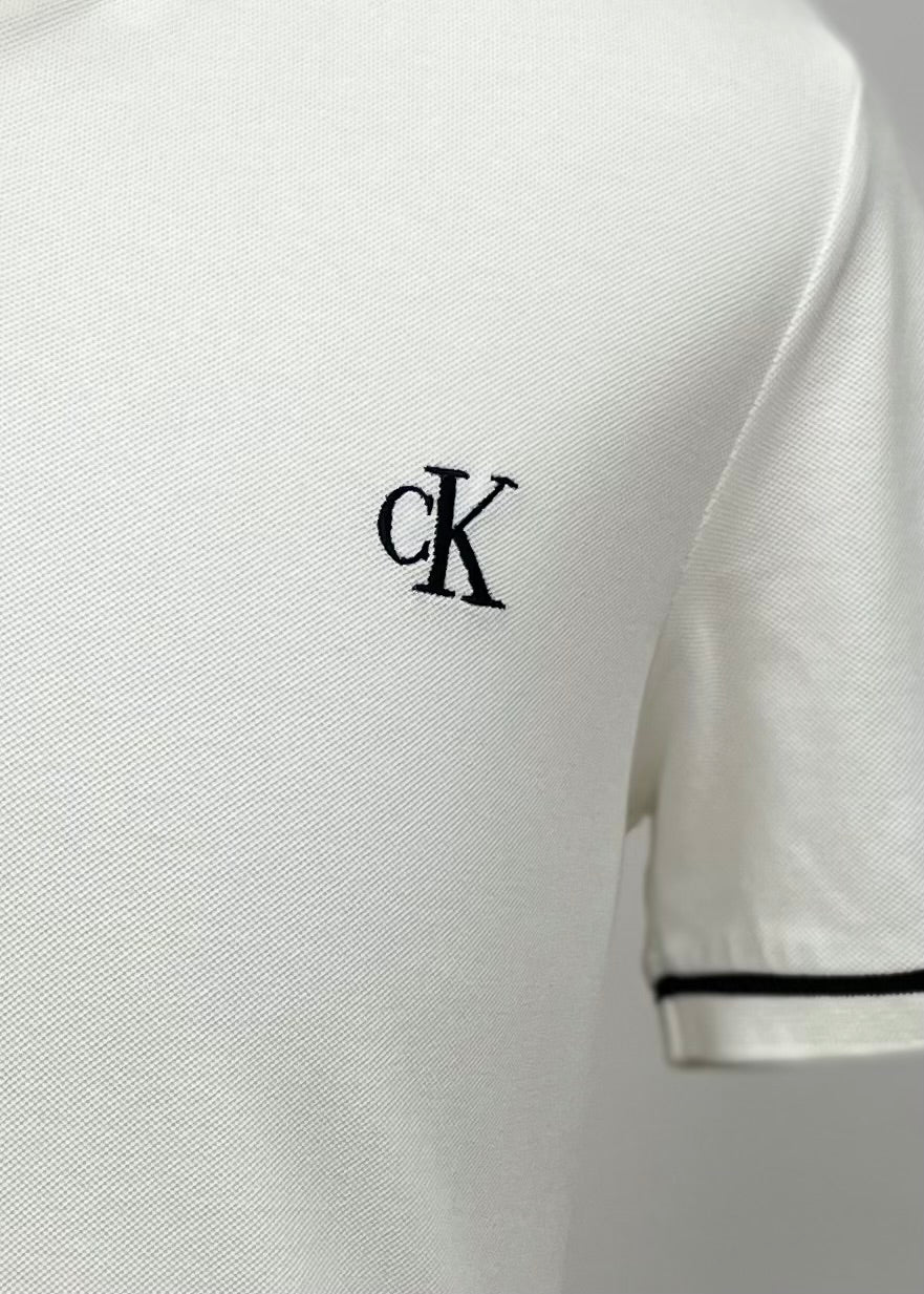 Camiseta Polo Calvin Klein CK color blanco con diseño de lineas en color negro Talla L Entalle Slim Fit