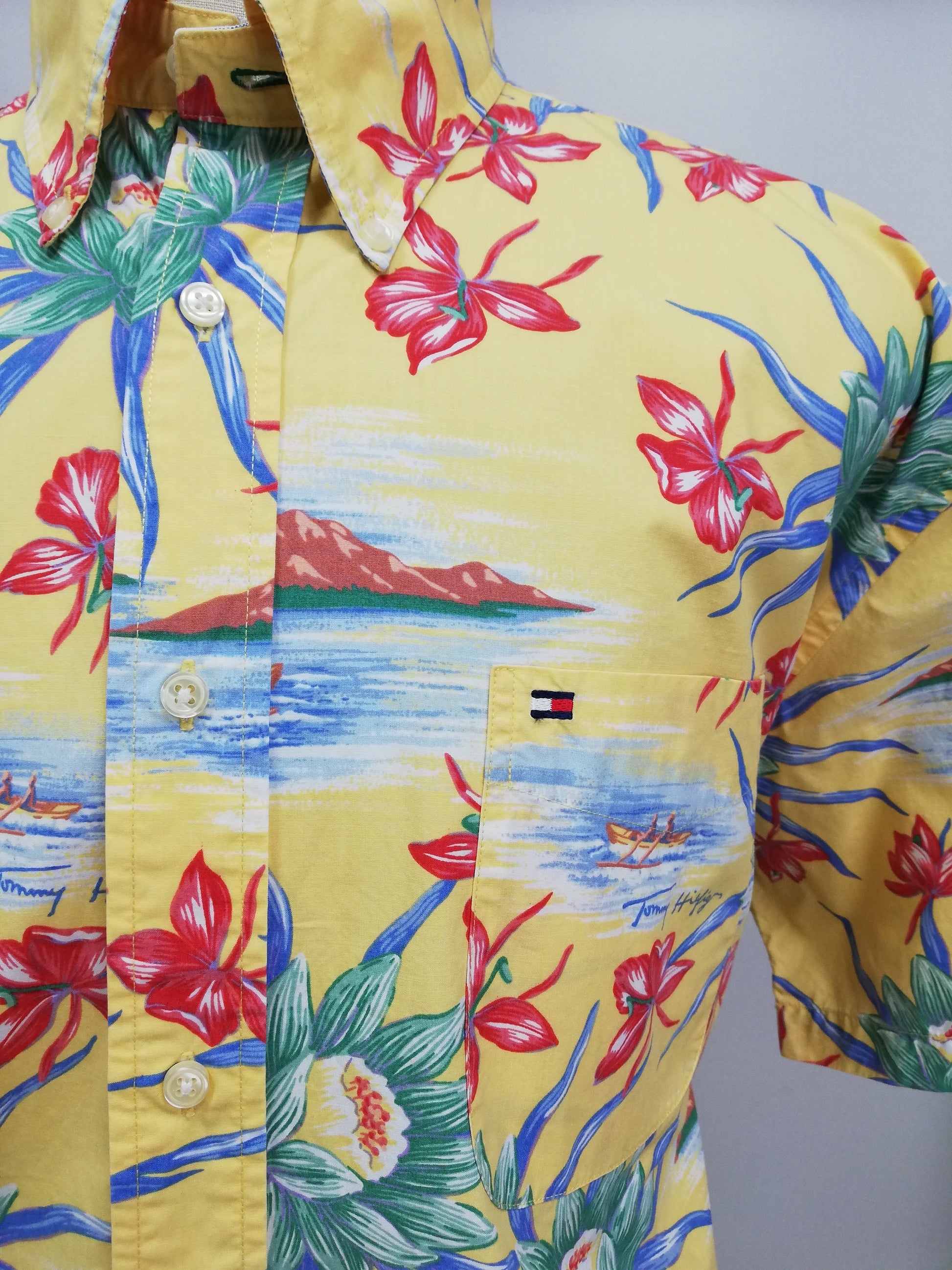 Camisa de botones Tommy Hilfiger 🇺🇸 color amarillo con diseño de tropical en rojo, azul y verde Talla XL Entalle Regular