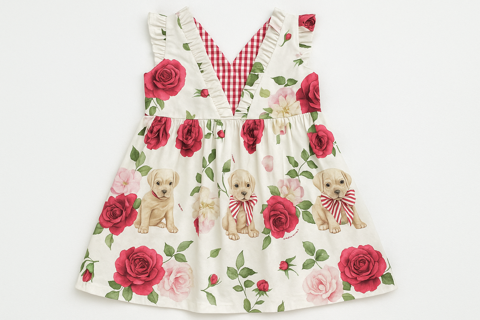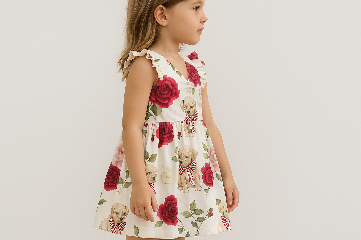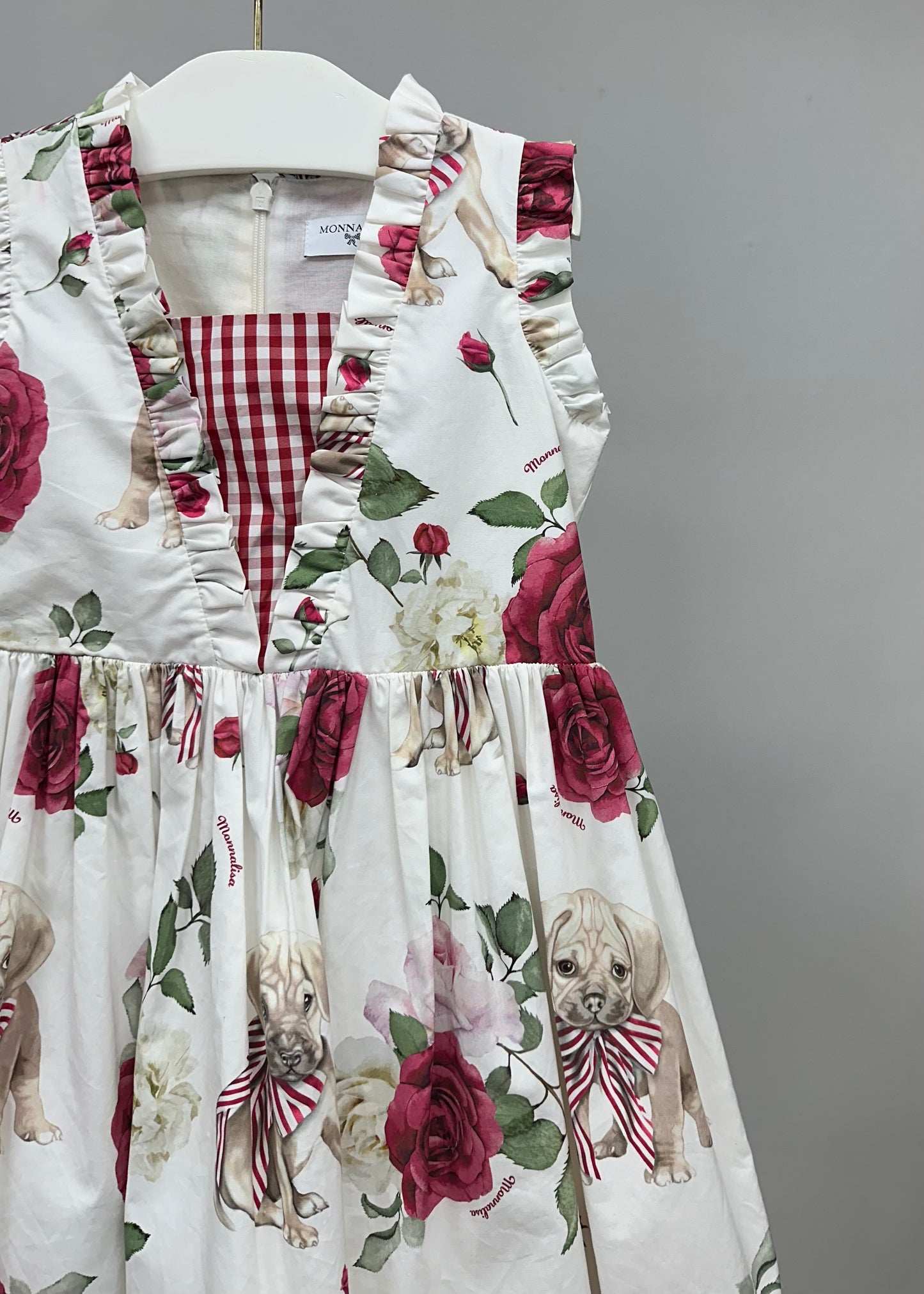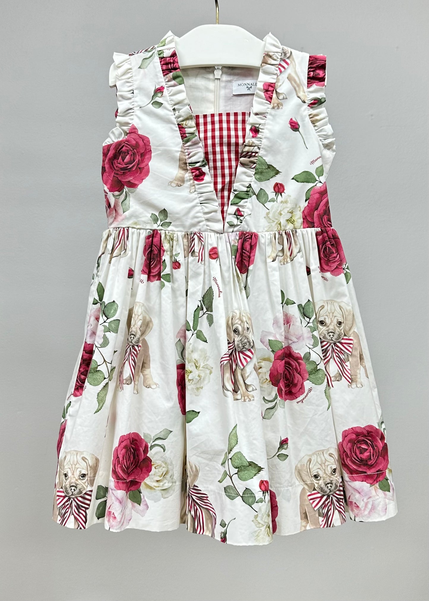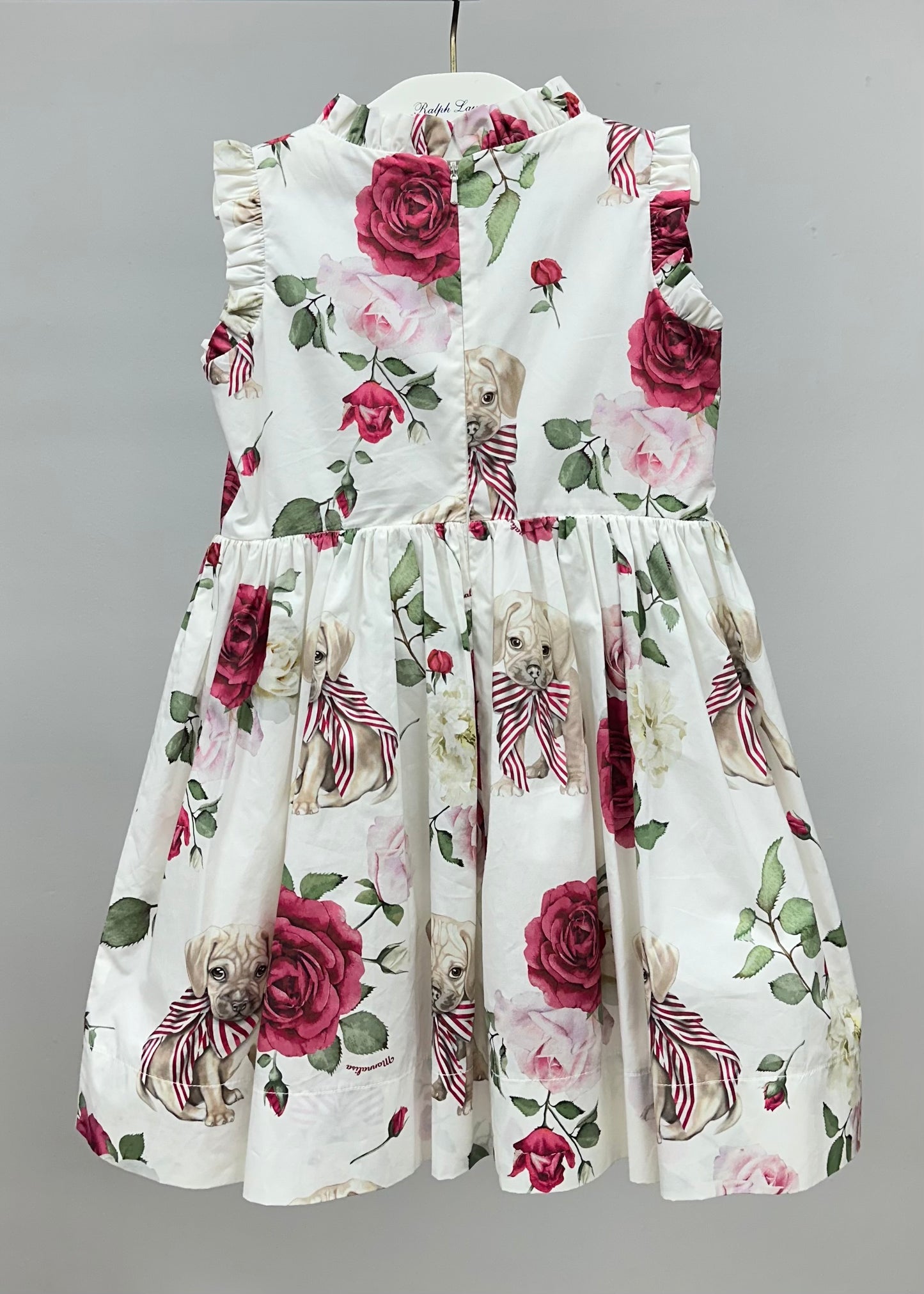 Vestido italiano de niña Monnalisa🎀 blanco con estampado de rosas y cachorros Talla 5