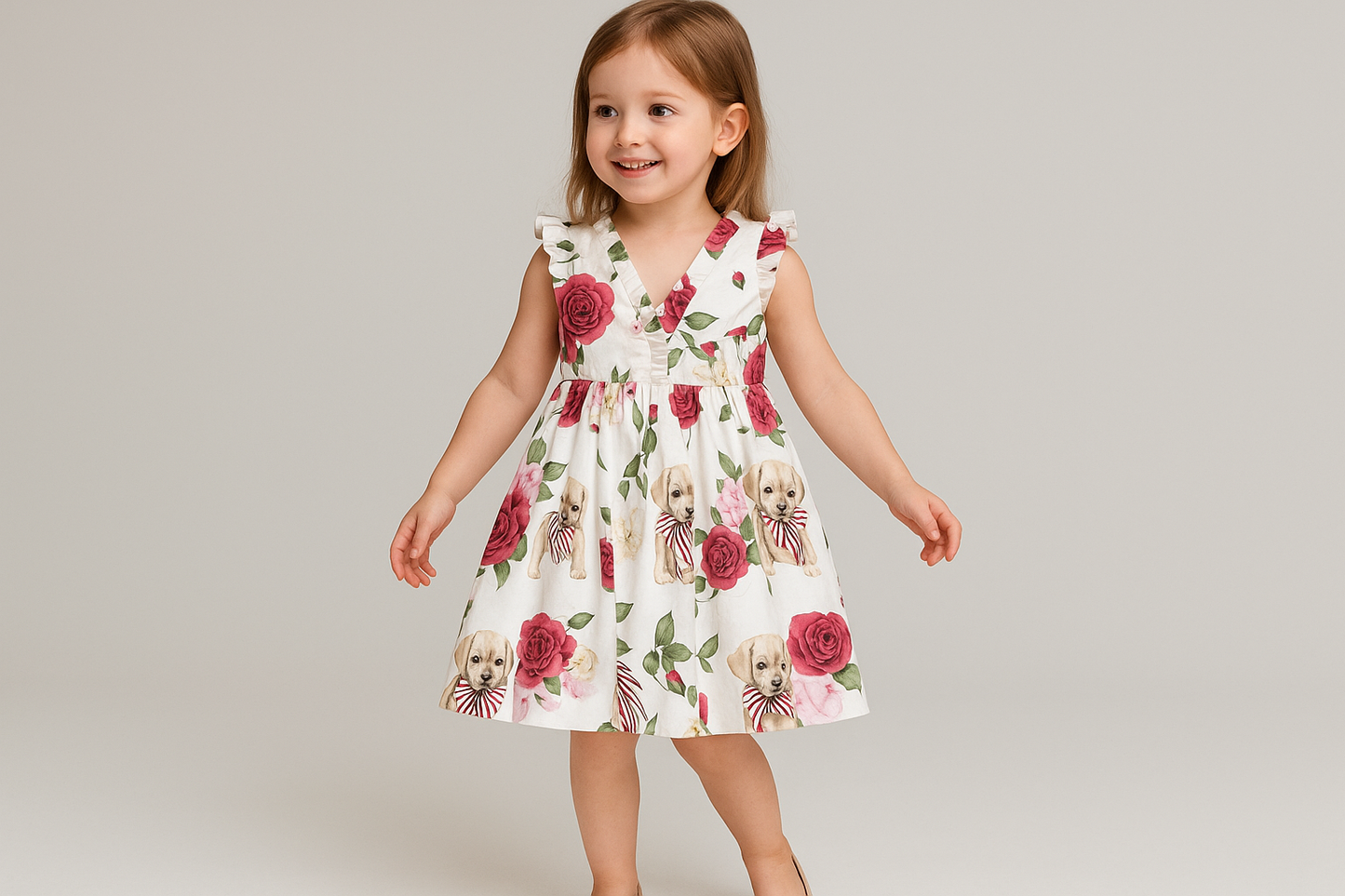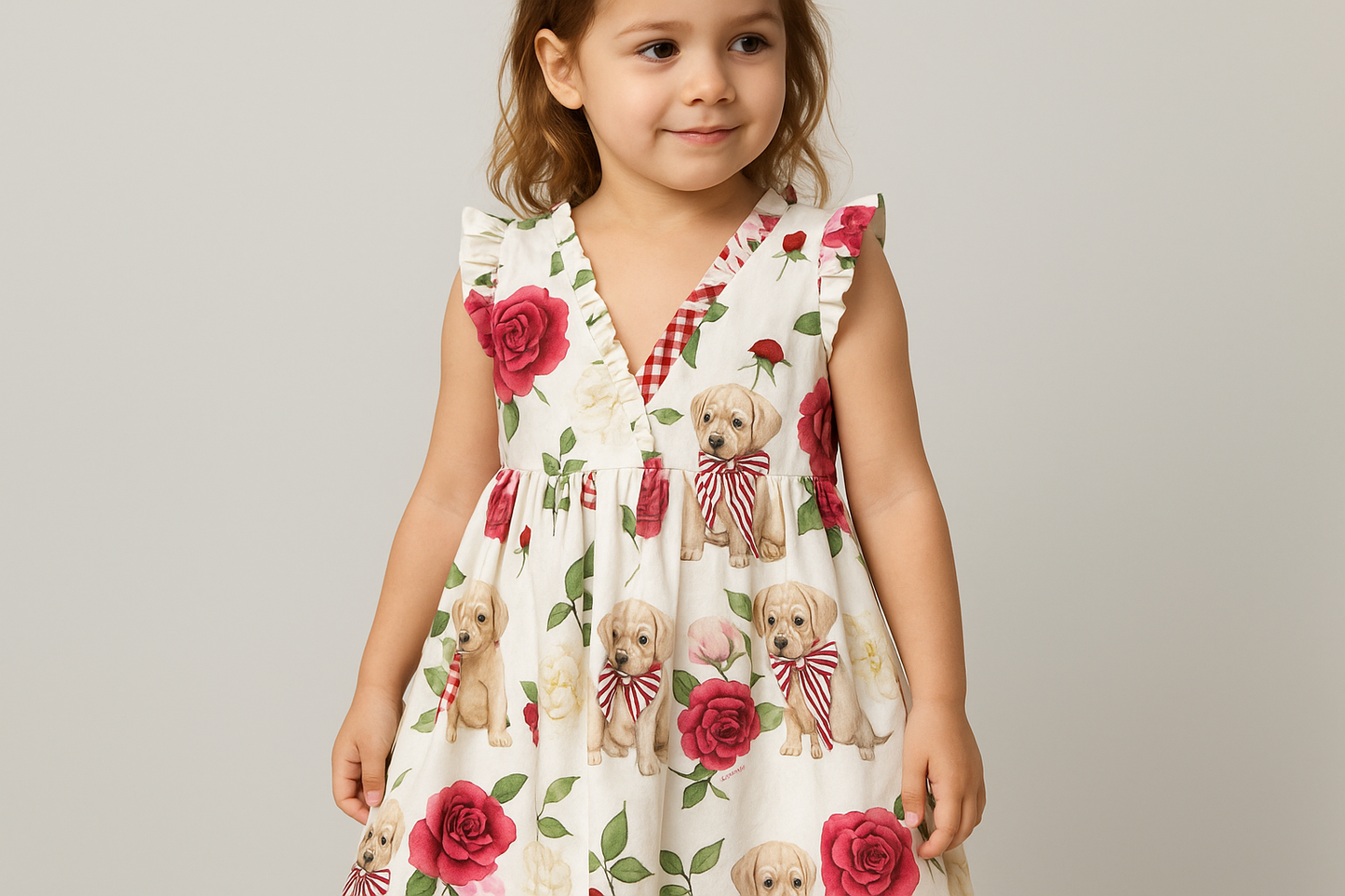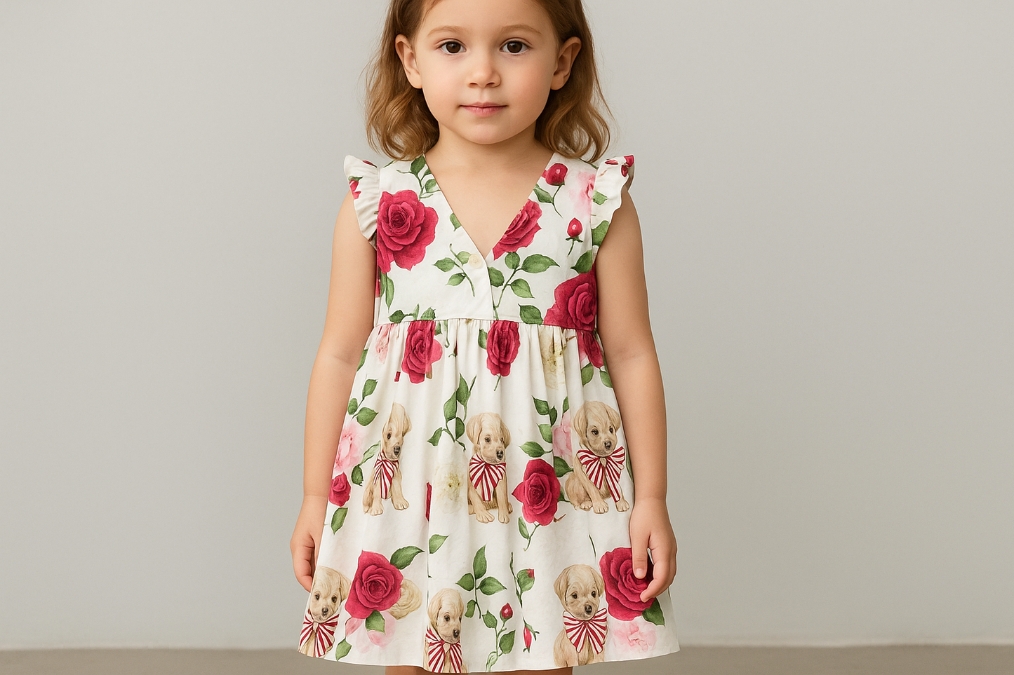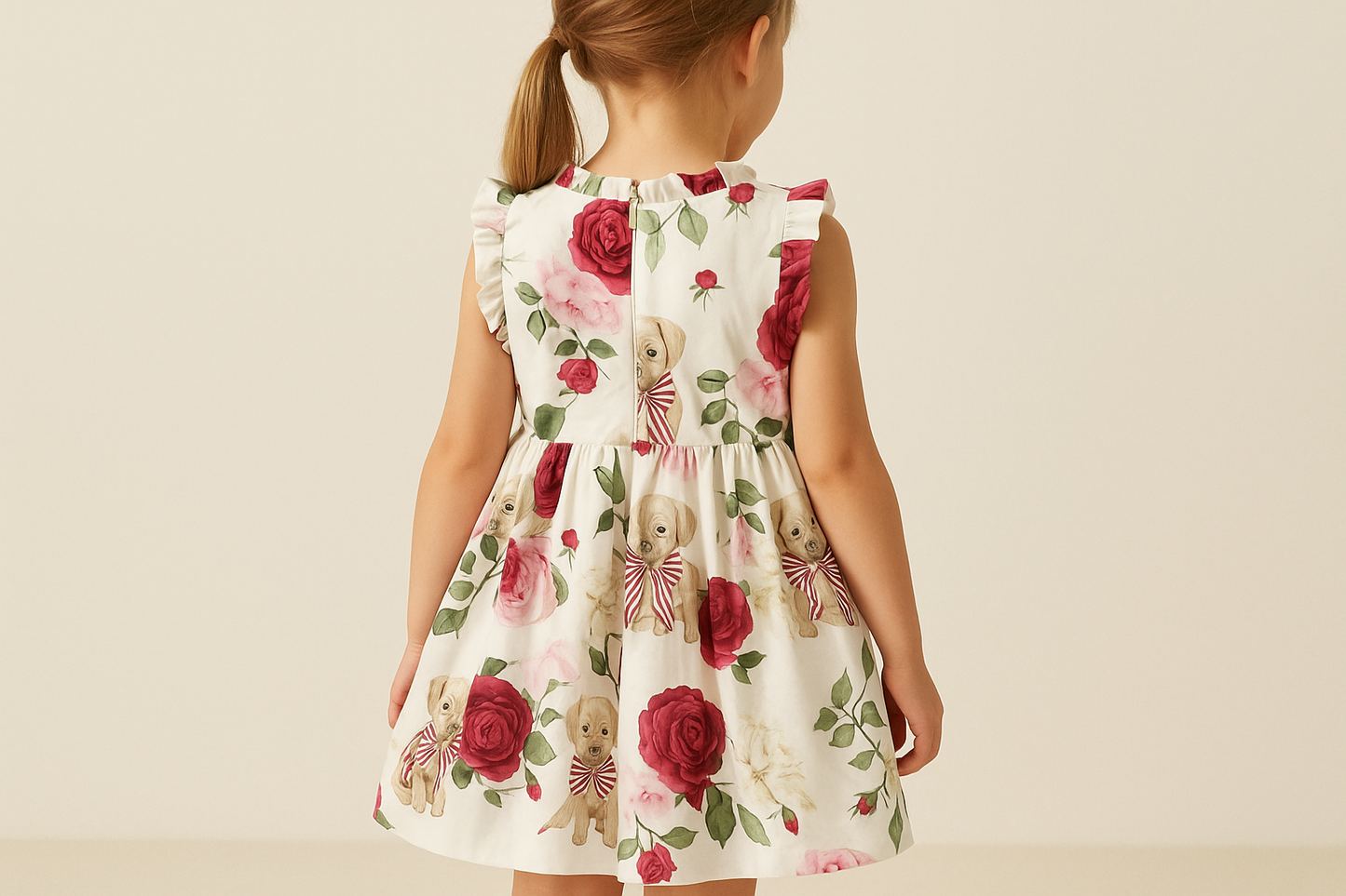Vestido italiano de niña Monnalisa🎀 blanco con estampado de rosas y cachorros Talla 5