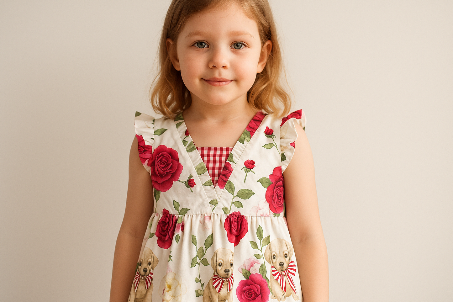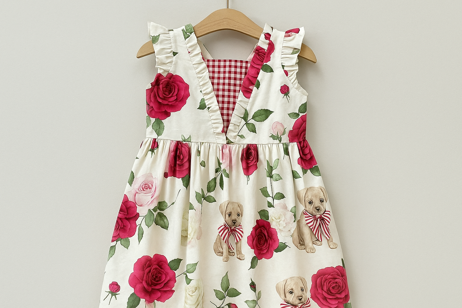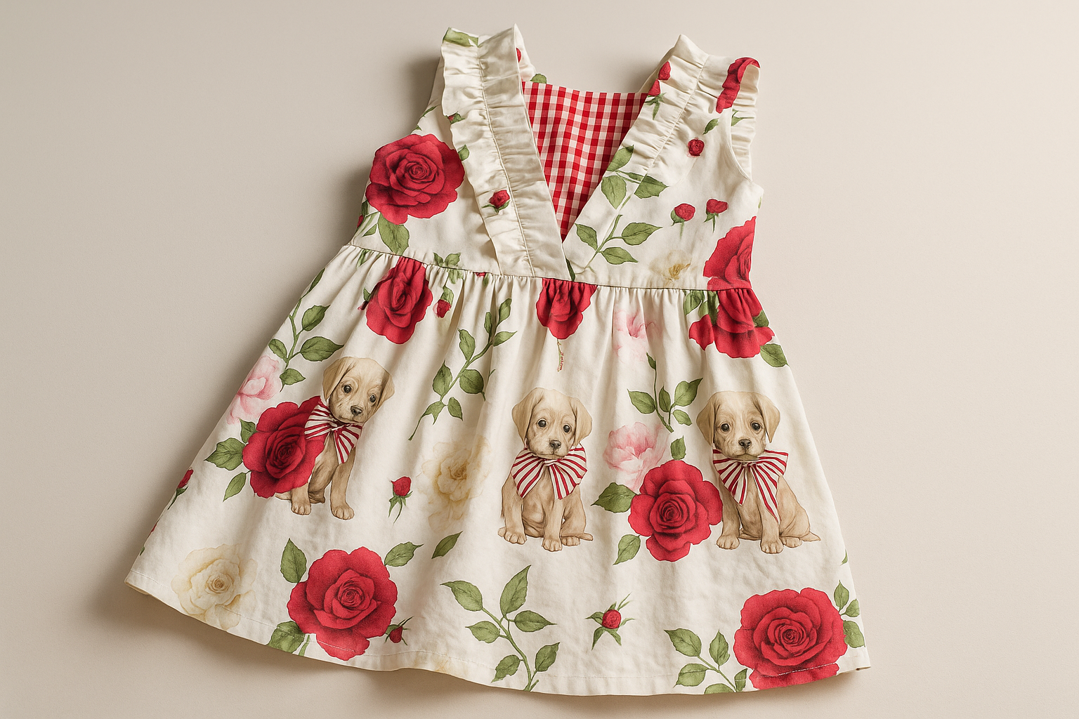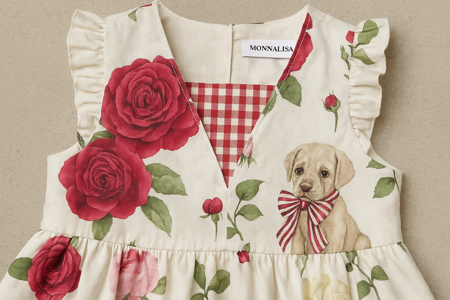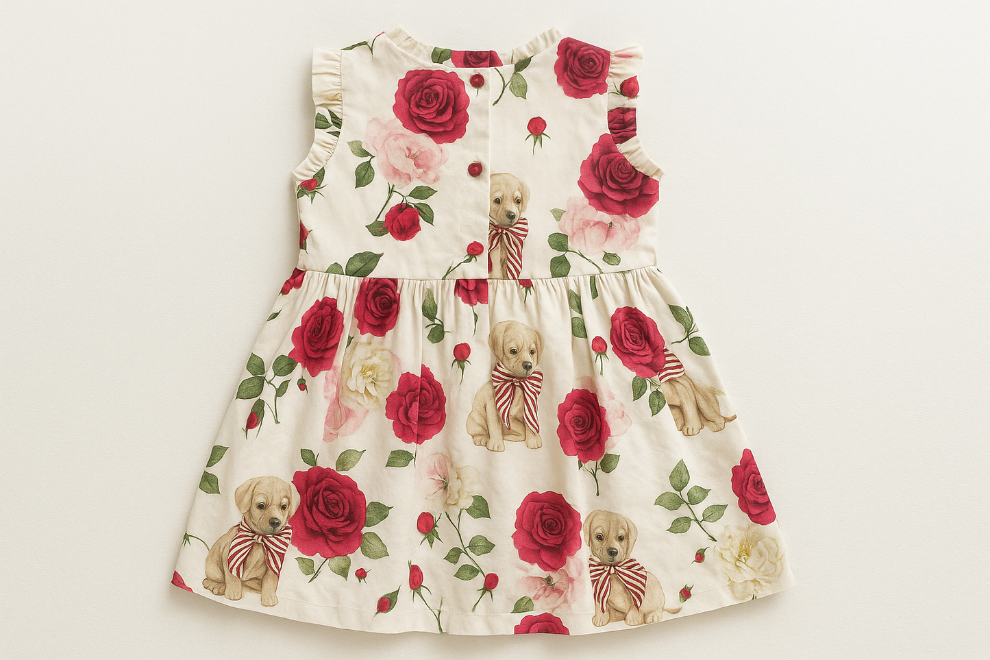 Vestido italiano de niña Monnalisa🎀 blanco con estampado de rosas y cachorros Talla 5