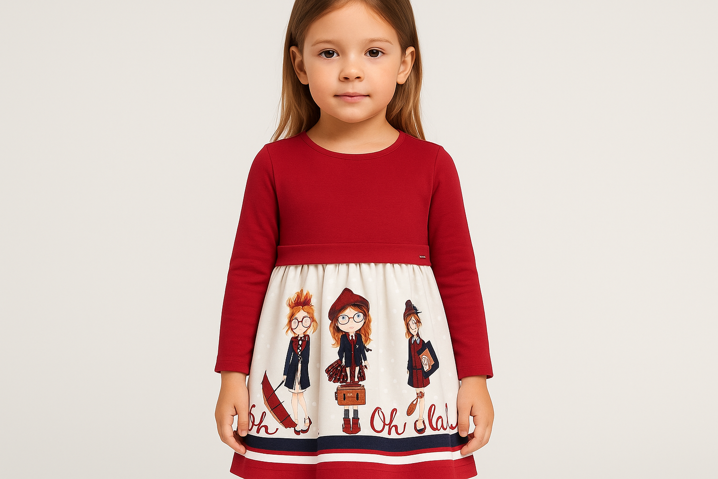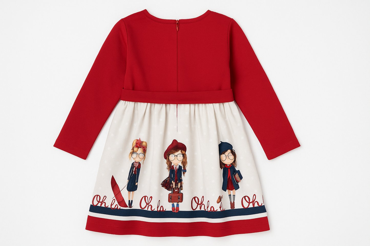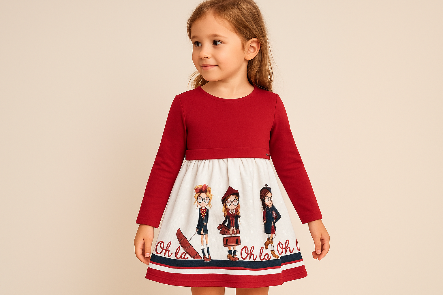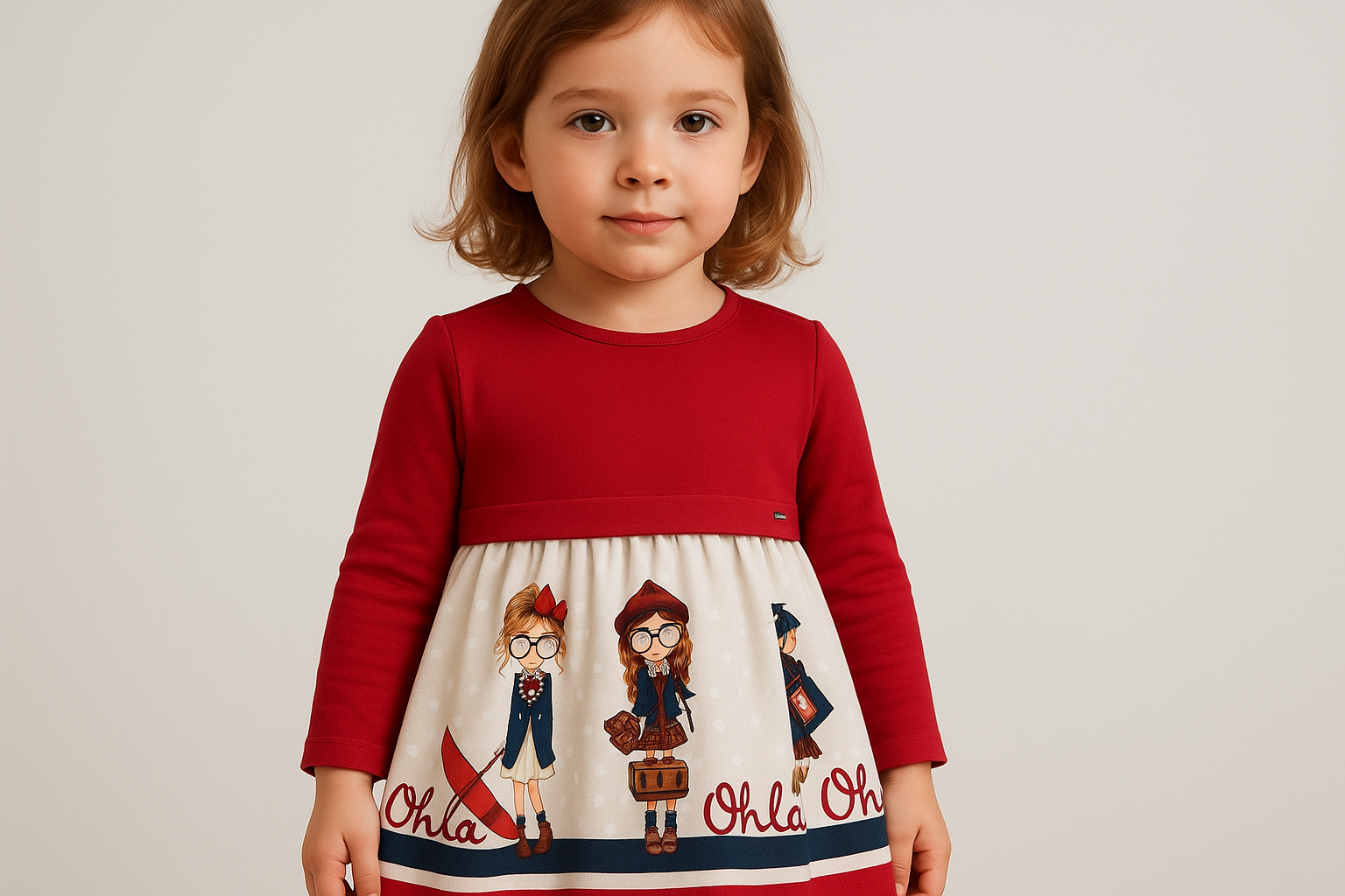Vestido español de niña Mayoral☁️ Manga larga Color rojo y gris con dibujos de niñas Talla 5
