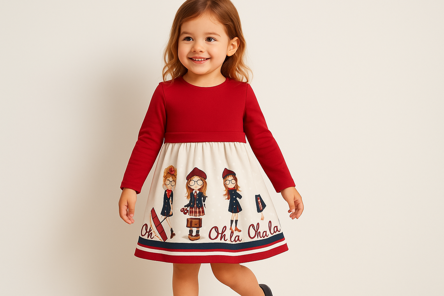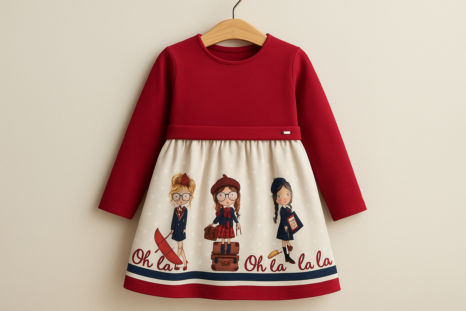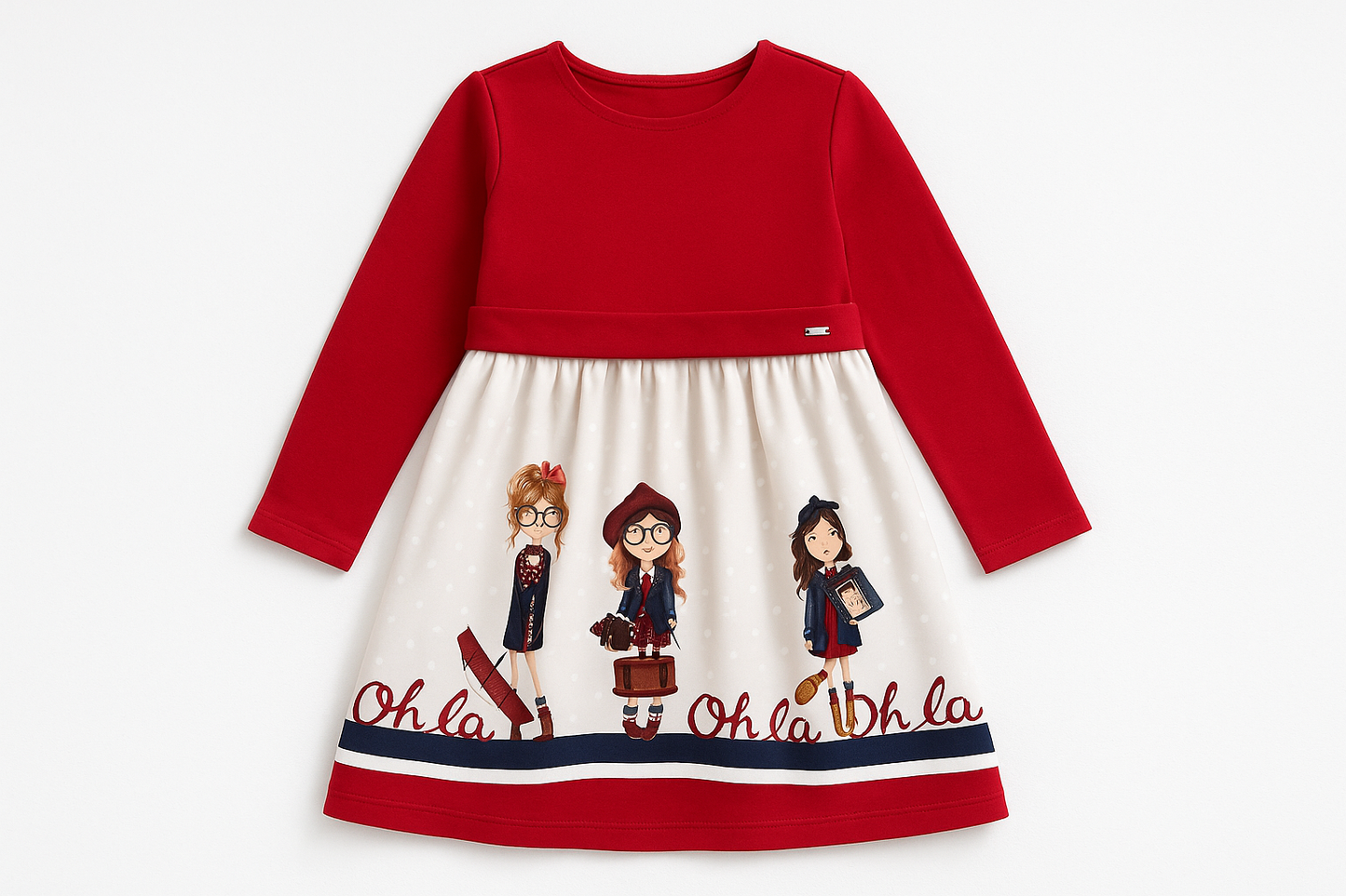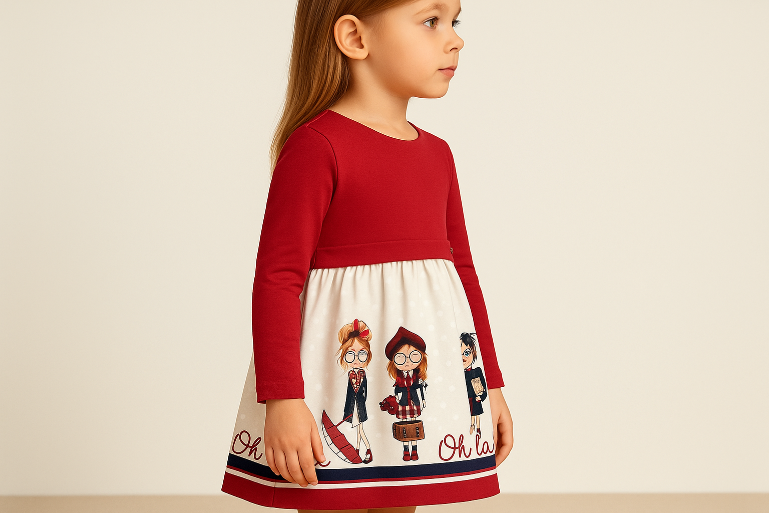 Vestido español de niña Mayoral☁️ Manga larga Color rojo y gris con dibujos de niñas Talla 5