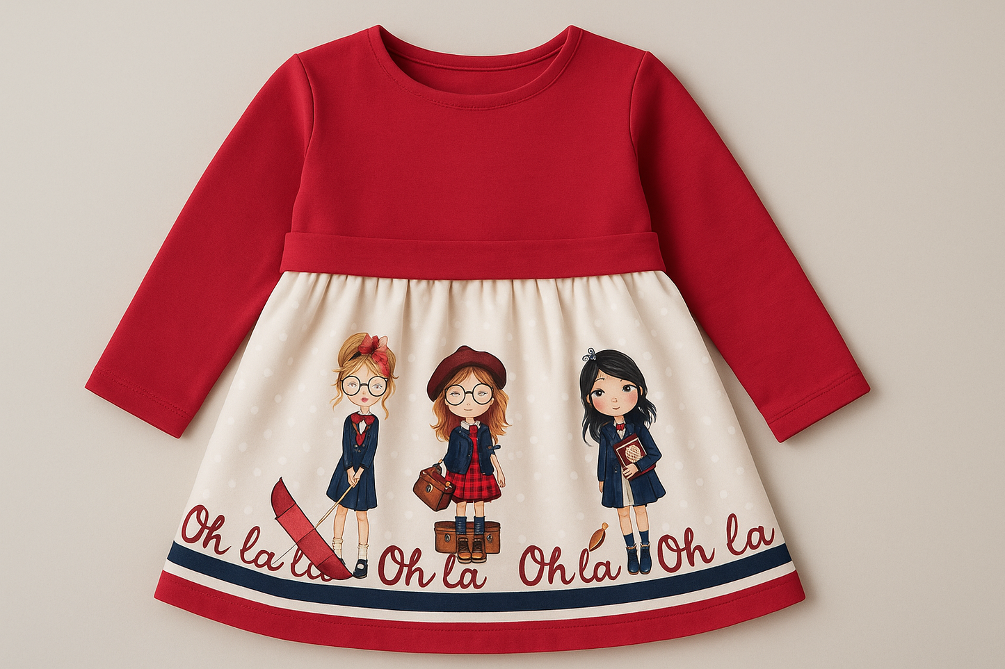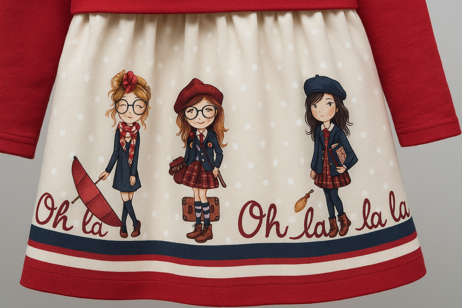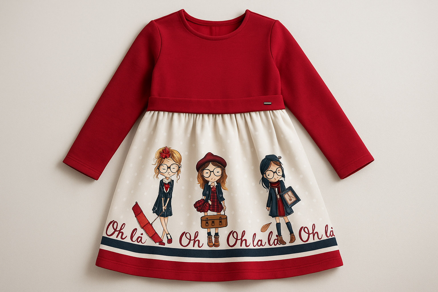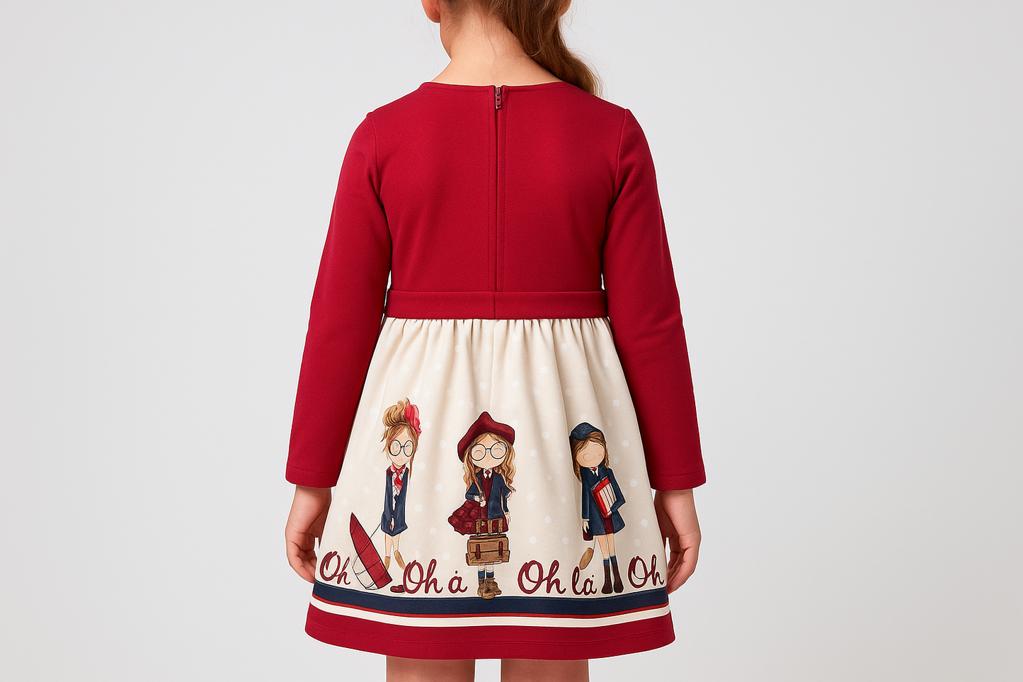 Vestido español de niña Mayoral☁️ Manga larga Color rojo y gris con dibujos de niñas Talla 5
