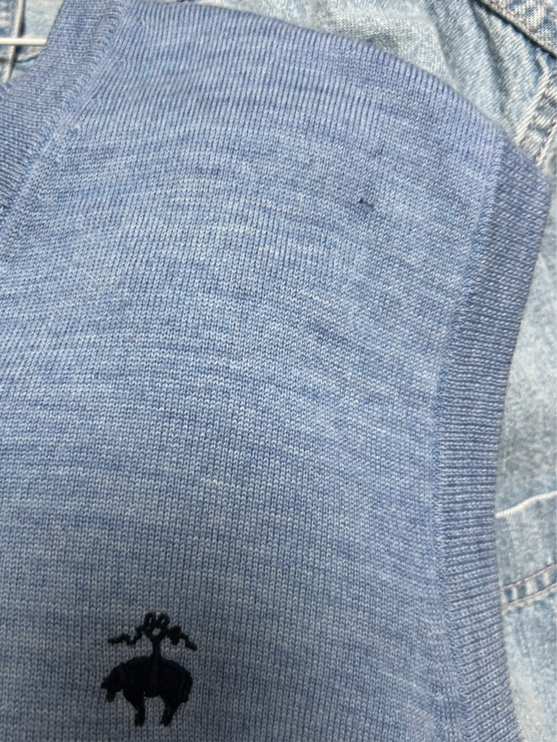 Sueter Jersey en cuello V Brooks Brothers 🐑 - Talla Large - Entalle regular - Chaleco sin mangas (vest) - Color celeste y logo bordado tradicional en azul navy - Tela de algodón - Buen estado 8/10 (tiene pequeño agujero en el hombro) - Precio $20 💵 DM 📩 Por si tiene alguna consulta